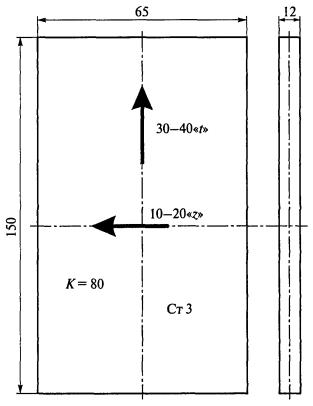 Нажатием кнопки 8 при загорании индикаторной лампы 9 (рис. И.1) устанавливается автоматический режим работы прибора фиксации максимального сигнала. Накладной датчик 1 плотно устанавливается на поверхности эталонного образца таким образом, чтобы его наибольшая ось, помеченная на датчике, располагалась вдоль оси t эталонного образца (рис. И.5), имитирующего замер магнитного шума в окружном направлении. Для произведения замера следует: нажать и отпустить кнопку 10 на датчике или кнопку 11 на передней панели прибора; слегка покачивая датчик, снять отсчет показаний на цифровом табло 12. Эта операция должна повториться не менее трех раз. Значение сигнала МШt в фиксируемом положении датчика определяется как средняя величина по результатам не менее трех измерений. Затем датчик устанавливается на поверхность эталонного образца вдоль оси Z перпендикулярно направлению оси t и аналогичным образом замеряются значения сигнала в направлении оси Z (MIIIz).