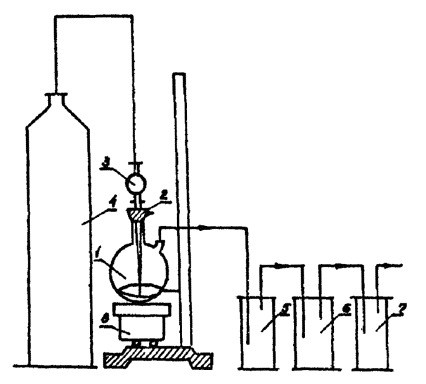 Реактор 1 закрывают резиновой пробкой 2 с делительной воронкой 3. Делительную воронку соединяют с газовым баллоном 4, а реактор - со склянками Дрекселя 5, 6, 7, каждая из которых заполнена 100 см3 10 %-ного раствора ацетата кадмия. Открывают кран воронки и вентиль газового баллона. Скорость подачи - проскок 1-2 пузырька в секунду - регулируют вентилем редуктора.