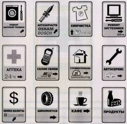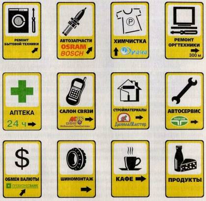 Пример указания стрелкой направления движения и расстояния к указываемому объекту, размещения логотипов и торговых марок указываемого объекта, а также логотипов и торговых марок фирм, продукция которых представлена в указываемом объекте или осуществляется ее сервисное обслуживание. Приложение к ОДН 218.015-01