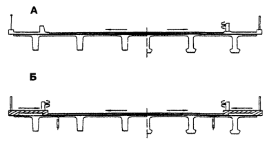 Кd - коэффициент реактивного сопротивления бетона, принимаемый равным 12R; Еs - модуль упругости стали хомута. 5.6.5. Значения Nx и Qx вычисляются, исходя из условия, что главные растягивающие напряжения, которые до образования трещины воспринимались бетоном, полностью передаются на хомуты и продольную распределительную арматуру. При определении главных растягивающих напряжений учитывают возможные дополнительные напряжения в стенке, вызванные резким перепадом температур воздуха (п. 3.2), принимая 20-процентную вероятность появления таких температурных воздействий (т.е. с коэффициентом S4 = 2,2 в (3.7)). 5.6.6. При определении остаточного ресурса проверка хомутов по признаку выносливости выполняется от момента раскрытия наклонной трещины на величину a = 0,5 мм. Момент раскрытия трещины на 0,5 мм принимается по году первого упоминания об этом в материалах обследования. Если при предшествующей идентификации раскрытие трещины составляло менее 0,5 мм, а при последующей - более 0,5 мм, расчетный момент достижения acr = 0,5 мм определяется интерполяцией. ПРИЛОЖЕНИЕ 1ПЕРЕЧЕНЬ РАБОТ ПО СОДЕРЖАНИЮ И РЕМОНТУ ЖЕЛЕЗОБЕТОННЫХ ПРОЛЕТНЫХ СТРОЕНИЙ, ВВЕДЕННЫХ В КЛАССИФИКАЦИЮ РОСАВТОДОРАА. Уход Нормативные постоянные работы Весенне-летне-осеннее содержание - очистка поверхностей от грязи, наносного грунта, растительности; - промывка опорных узлов балок; - нанесение вертикальной разметки на низ фасадных балок путепроводов над автодорогами. Зимнее содержание - очистка от снега, льда торцевых участков. Надзор Ø постоянный надзор - проведение осмотров каждые 10 дней; Ø весенний осмотр (периодический) с составлением ведомостей дефектов и графика их устранения в рамках сверхнормативных работ по содержанию; Ø осенний осмотр (текущий) с составлением ведомостей дефектов; Ø ведение книги искусственного сооружения; Ø уход за смотровыми устройствами. Специальные работы по надзору q плановая диагностика мостового сооружения (1 раз в 5 лет); q плановое обследование (первое - через 15 лет, далее - 1 раз в 10 лет); q наблюдение за состоянием сооружений в предремонтный период (с момента оценки «неудовлетворительно» - ежегодно, вплоть до начала ремонта); q предпроектное обследование для составления проекта ремонта (реконструкции) сооружения; q обследование для оценки работы сооружения; q испытание, если необходимо выявление фактической работы сооружения. Б. Профилактика · устройство козырьков для устранения попадания воды на фасадные поверхности конструкций; · гидрофобизация фасадных конструкций (балок, арок, стоек и плиты надарочных элементов), а также опорных узлов; · заделка трещин и сколов, устранение повреждений одиночных участков защитного слоя бетона конструкций; · устранение нарушенных связей (приварка накладок диафрагм, бетонирование сколов бетона и др.); · защита от коррозии локально оголенной арматуры; · затирка одиночных трещин на поверхности бетона. В. Планово-предупредительные работы ¨ гидрофобизация или окраска бетона конструкций (плиты, ребер балок, арок и др. элементов); ¨ ремонт диафрагм; ¨ заделка бетоном проломов в плите проезжей части с установкой дополнительной арматуры; ¨ устранение дефектов в элементах с установкой дополнительной арматуры и с устройством опалубки (сколы бетона глубиной до 100 мм с оголением рабочей арматуры и хомутов) на всей площади поверхно
