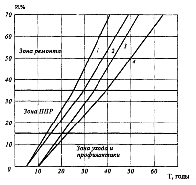 2.2.2. Накопление повреждений в конструкциях графически представлено на рисунках 2.3 - 2.9. На приведенных рисунках область накопления повреждений разделена на 3 участка: И £ И1 - участок, в пределах которого требуются затраты лишь на содержание (надзор, уход и профилактика); И1 £ И £ [И] - участок, в пределах которого выполняются работы по мелкому ремонту (ППР - ремонт элементов); [И] £ И £ Ипред. - участок, в пределах которого требуются затраты на ремонт всего пролетного строения (усиление, замена отдельных элементов, полное восстановление). Рис. 2.3. График долговечности железобетонных ребристых пролетных строений с обычной арматурой для условий «Центра» и «Севера» (табл. 2.4, пп. 1 и 2): 1 и 3 - сборные диафрагменные, на дорогах I - II категорий, с гидроизоляцией, соответственно, в пределах габарита (l = 0,015) и по всей ширине (l = 0,0125); 2 и 4 - сборные диафрагменные, на дорогах III - IV категорий, с гидроизоляцией, соответственно, в пределах габарита (l = 0,012) и по всей ширине (l = 0,01).