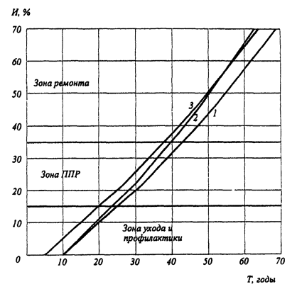 Рис. 2.4. График долговечности железобетонных ребристых пролетных строений с обычной арматурой для условий «Центра» и «Севера» (табл. 2.4, пп. 3 и 4): 1 и 2 - сборные бездиафрагменные пролетные строения, соответственно, на дорогах III - IV категорий (l = 0,009) и на дорогах I - II категорий (l = 0,01); 3 - монолитные ребристые пролетные строения (l =0,009).