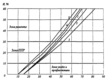 Рис. 2.6. График долговечности железобетонных плитных пролетных строений с гидроизоляцией по всей ширине для условий «Центра» и «Севера» (см. табл. 2.6): сборные диафрагменные: 1 и 2 - сборные пустотные плиты с обычной арматурой: соответственно, на дорогах III - IV категорий (l = 0,0012); и на дорогах I - II категорий (l = 0,015); 3 - монолитные сборные плиты сплошного сечения с обычной арматурой (l = 0,01); 4 и 5 - сборные пустотные плиты с напрягаемой арматурой: соответственно, на дорогах III - IV категорий (l = 0,01) и на дорогах I - II категорий (l = 0,013).