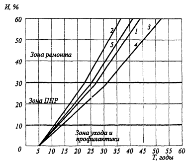 Рис. 2.5. График долговечности железобетонных ребристых пролетных строений с предварительно напряженной арматурой для условий «Центра» и «Севера» (см. табл. 2.5): сборные диафрагменные: 1 и 2 - на дорогах III - IV категорий с гидроизоляцией по всей ширине и в пределах габарита, соответственно (l = 0,0085); 3 и 4 - на дорогах I - II категорий по всей ширине и в пределах габарита, соответственно (l = 0,008); 5 - сборные бездиафрагменные на дорогах I - IV категорий с гидроизоляцией по всей ширине (l = 0,007).