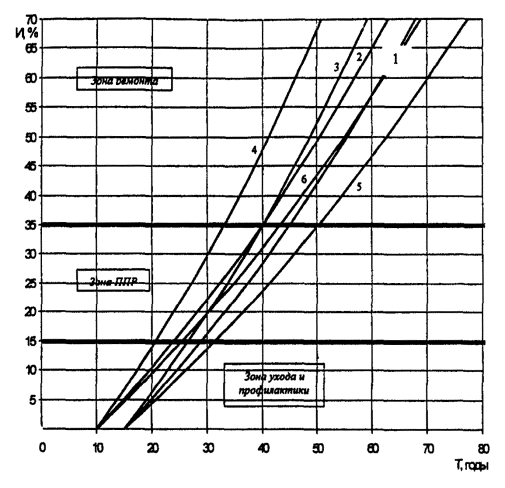 Рис. 2.7. График долговечности железобетонных ребристых пролетных строений с обычной арматурой для условий «Юга» (см. табл. 2.7): 1 и 2 - сборные диафрагменные на дорогах III и IV категорий: с гидроизоляцией, соответственно, по всей ширине и в пределах габарита (l = 0,01); 3 и 4 - сборные диафрагменные на дорогах I и II категорий: соответственно, с гидроизоляцией по всей ширине (l = 0,012) и в пределах габарита (l =0,013); 5 - сборные бездиафрагменные (l = 0,0085); 6 - монолитные диафрагменные (l = 0,009).