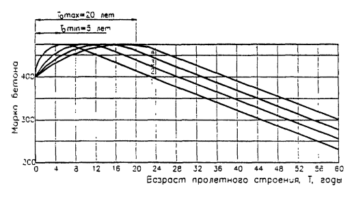 предельным усилием Рис. 4.3. Прогноз работоспособности балок пролетного строения: 1 - резерв в несущей способности, полученный на стадии проектирования и строительства; 2 - снижение прочности для различных балок пролетного строения; 3 - ремонт (усиление) четырех балок в момент ti = Тр; 4 - снижение прочности отремонтированных балок. 4.5. Увеличение срока службы в процессе строительстваРегулирование срока службы в процессе строительства возможно за счет внесения изменений в характеристики материалов и конструкций на различных этапах строительства. Например, если своевременно обнаруживается проявление недостатков строительства, то следует считать возможным и оправданным: v применение балок с большей несущей способностью по сравнению с первоначальными требованиями; v применение бетона повышенной прочности; v регулирование толщины защитного слоя и количества арматуры. Более реальным в процессе строительства, а в некоторых случаях и по его завершению, является не регулирование, а увеличение работоспособности и срока службы за счет: q увеличения размеров консоли плит крайних балок путем устройства карнизов, что снижает влияние климатических факторов на старение бетона фасадных поверхностей; q защиты поверхности бетона специальными защитными покрытиями с увеличенным сроком службы; q замены гидроизоляционных систем и дополнение системы водоотвода дренажными устройствами; q инъектирования появившихся трещин; q применения бетона повышенной прочности. ГЛАВА 5. ОПРЕДЕЛЕНИЕ ОСТАТОЧНОГО РЕСУРСА ПРОЛЕТНЫХ СТРОЕНИЙ ЭКСПЛУАТИРУЕМЫХ МОСТОВ5.1. Общие положения5.1.1 Рекомендации данной главы используются при прогнозировании срока службы эксплуатируемых мостов (возраст больше Т0). Основанием для прогноза служат исходные данные на момент строительства (начальные характеристики) и данные на момент идентификации (обследования), которые экстраполируются на будущее. Прогнозируется работоспособность и предельный срок службы на основании расчета конструкций по фактическим параметрам старения материалов. 5.1.2. Выполняются расчеты срока службы эксплуатируемых мостов по показателям: q выносливости плиты; q прочности нормальных и наклонных сечений балок; q продольной трещиностойкости балок; q выносливости хомутов в зоне трещин. 5.1.3. Особенностью определения остаточного ресурса эксплуатируемых пролетных строений является то, что все характеристики принимаются не по нормативным значениям, а определяются на основании фактических замеров. Определяются все характеристики, упомянутые в пп. 4.1.3, а также: Ø фактическая толщина элементов; Ø коррозия арматуры (хомутов и основных стержней); Ø величина обжатия бетона в предварительно напряженных конструкциях (по специальной методике); Ø наличие трещин в несущих конструкциях для последующего определения их влияния на несущую способность сечения (по специальной методике); Ø процент содержания хлоридов в бетоне; Ø коэффициент вариации при оценке карбонизации бетона. 5.2. Характеристики материалов и конструкций. Параметры воздействий5.2.1. Прочность бетона на момент идентификации определяется по результатам измерений, а график изменения прочности для различных участков строится с учетом показателей прочности из исполнительной документации и требований СНиП, табл. 25 [1]. График изменения прочности (по ан