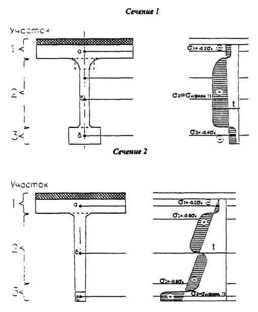 3.2.4. Растягивающие напряжения определяются для середины ребра в предварительно-напряженных балках (рис. 3.2, точка «б») и для нижнего участка ребра в балках с обычной арматурой (см. рис. 3.2, точка «в»). Растягивающие напряжения рассчитывают по формуле: где fm и fs - площадь поперечного сечения элемента наименьшей массивности (для которого определяется s) и площадь остальной части поперечного сечения (с учетом площади слоев одежды); m - поправочный коэффициент, принимаемый равным 1,0 для sв в сечении 1 и 2,5 - для sв в сечении 2; Е - модуль упругости бетона, для класса бетона, предусмотренного проектом; Dt - разность между температурой элемента меньшей массивности и средней температурой, tcp, остальных элементов сечения, определяемой по формуле: