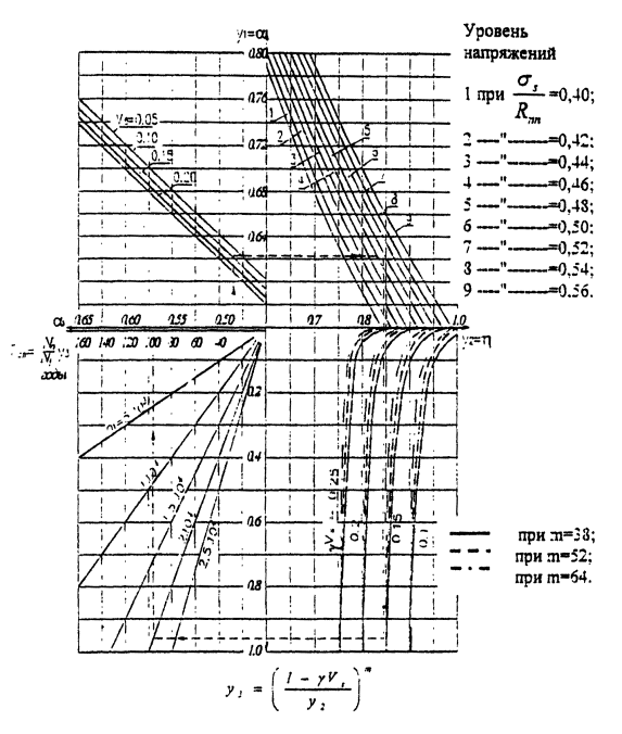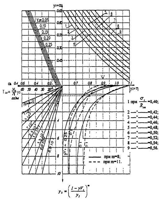 *) В числителе - для Vs = 0,05; в знаменателе - для Vs = 0,10. **) В скобках указан класс арматуры, не испытанной на выносливость (показано условно). Рис. 4.1. Срок службы по выносливости высокопрочной арматуры класса В-II Рис. 4.2. Номограмма. Срок службы по выносливости арматуры (класс А-II) 4.3.3. Срок службы по