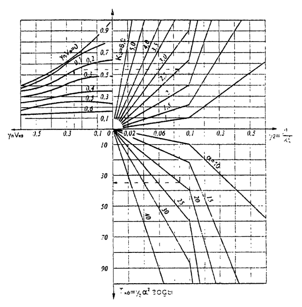Расчеты Ткб возможно проводить по номограмме (рис. 5.2) с использованием значений Vn, Vkэ, Кэ (табл. 5.1) и a. Обозначения, принятые в номограмме: a - средняя толщина защитного слоя бетона (мм); Vа, Vkэ, Vx - коэффициенты вариации защитного слоя, диффузии и глубины карбонизации, соответственно; gn - характеристика надежности (gn = 1,645 при вероятности 0,95), квантиль; Кэ - средняя величина эффективного коэффициента диффузии (мм/год1/2), где
