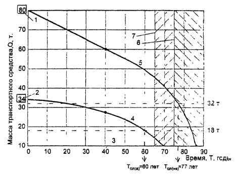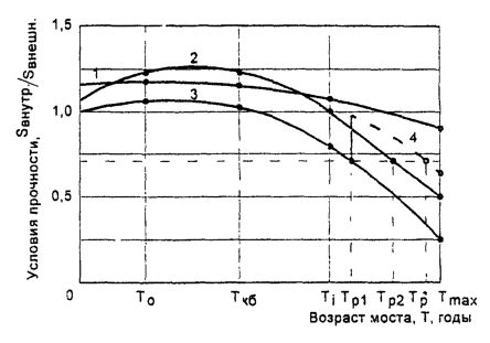 означает уменьшение расчетного значения В Проекте эксплуатации моста или Рекомендациях по эксплуатации, разработанных по результатам обследований эксплуатируемых мостов, указывается желательное время введения ограничений по массе (TQ) и период эксплуатации до ремонта после введения ограничений. Наиболее целесообразным для введения ограничений является интервал времени между Тр (работоспособность по (4.1) и (4.3)) и Т0, а именно