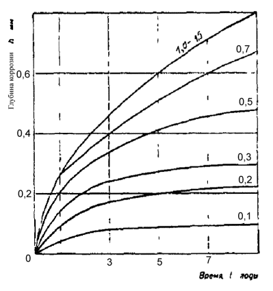 Качество гидроизоляции отмечено тремя состояниями: а) дефекты отсутствуют (принимается при проектировании); б) имеются отдельные (локальные) следы протечек через бетон консолей плит или из-под тротуаров; в) имеются протечки по всем продольным швам омоноличивания и плитам. На стадии проектирования, при Ктр = 1,0 и Кг =1,0, можно воспользоваться базовым графиком коррозии (рис. 3.4), на котором значения показателя функции l* даны для Кз = 1,0. Базовые показатели функции l* принимаются по данным табл. 3.7. Если коррозия арматурного элемента достигает 60 %, такой элемент в расчетах несущей способности сечения не учитывается. Рис. 3.4. График базовых показателей коррозии арматуры при Ткб = 0; Ктр = Кг = Кз = 1,0 Таблица 3.7 Базовые значения показателя функции износа арматуры, l*