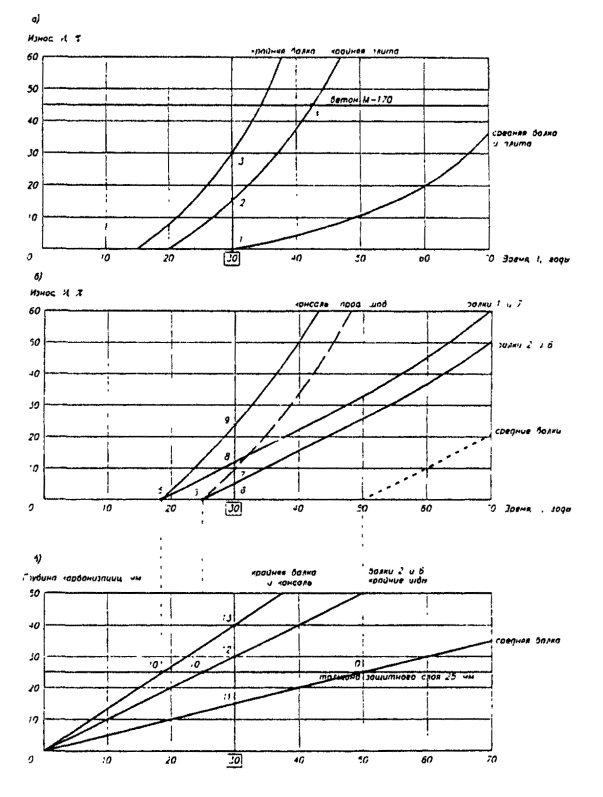 Рис. 1. Графики изменения во времени: а - марочной прочности бетона, Мв, конструкций (процент снижения по отношению к М300); б - коррозии арматуры (снижение площади Fa; в - карбонизации бетона защитного слоя, Кв, мм Таблица 1 Характеристики конструкции на разных участках