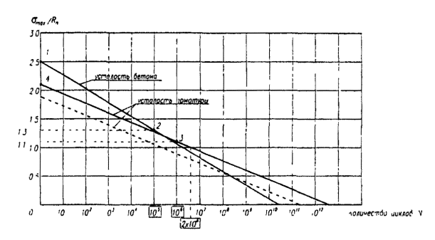smax - максимальные напряжения в бетоне от реальной эксплуатационной нагрузки (с учетом требования СНиП, п. 3.4); a - коэффициент, зависящий от уровня напряжений, создаваемых постоянной нагрузкой, и коэффициента вариации временной нагрузки Vs (табл. 4.1), sn - минимальные напряжения в бетоне; Rвп - призменная прочность бетона (средние значения); В - коэффициент, учитывающий изменение прочности бетона во времени, его постепенную деградацию (gR,w см. п. 3.1) и рост прочности бетона во времени, который принимается в соответствии с СНиП 2.05.03-84, п. 3.2.6 или табл. 4.2 данной Методики (bв); g - коэффициент, зависящий от принятой обеспеченности расчетного срока службы и соответствующий требуемому индексу надежности для построенного сооружения, 3,0. Для бетона железобетонной плиты, рассчитываемой по показателю выносливости, кривая усталости, по которой определяется число эквивалентных циклов, строится по упрощенной зависимости