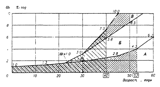 Рис. 2. График усталости бетона и арматуры Рис. 3. Накопление усталостных повреждений в бетоне плиты за счет влияния: А - интенсивности движения; Б - толщины плиты; В - прочности бетона Из-за изменения толщины плиты, которое приводит к увеличению напряжений в бетоне и арматуре, изменяется отношение s/R. В частности, для рассматриваемого случая снижение толщины бетона на 10 мм увеличивает напряжение в бетоне в 1,1 раза, что приводит к уменьшению базового числа циклов до 1·106 (точка 3, см. рис. 2) и к увеличению темпа накопления усталостных повреждений на 30-й год до 3 % в год. На 50-й год эксплуатации, когда эффективная толщина плиты снизится на 35 мм, а напряжения увеличатся в 1,3 раза, годовой процент накопления усталостных повреждений достигнет 8,5 % (зона «Б», см. рис. 3). Снижение прочности плиты в середине массива начинает проявляться лишь с 30-го года эксплуатации (см. рис. 1, а), но уже через 10 лет приводит к заметному снижению выносливости (показатель W возрастает на 1,5 %). Учитывая все три фактора (увеличение интенсивности движения, повреждение плиты под защитным слоем, снижение прочности бетона), получаем итоговый график накопления усталостных повреждений и снижения срока службы до 40 лет (заштрихованная зона, см. рис. 3). 3.4. Прогноз по показателю выносливости арматуры плитыВ соответствии с требованиями главы 4, а также используя формулу (4.3) и номограмму (см. рис. 4.2), определяем параметр, gз, на основании которого можно построить график усталости арматуры плиты. Из графика усталости (см. рис. 2) следует, что, если напряжения в арматуре превышают расчетное сопротивление (2700 кг/см2 для арматуры класса А-II) в 2,1 раза, т.е. достигается временное сопротивление (5600 кг/см2), разрыв арматуры происходит при одном цикле нагружения. Если напряжения в арматуре соответствуют расчетному сопротивлению, разрыв происходит при 2×106 циклах нагружения. Используя график усталости, определяется эквивалентность воздействия каждой оси (табл. 3). При реальном воздействии на момент идентификации при интенсивности движения 5000 авт./сут (t = 30 лет) ежегодное накопление усталостных повреждений составляет 0,5 %, а при воздействии на момент постройки - w = 0,3 %. Накопление усталостных повреждений до появления в арматуре пластического шарнира (начало появления «шейки») происходит несколько большими темпами (пунктирная линия усталости, см. рис. 2) и составляет 0,7 % в год (табл. 4). Таблица 3 Эквивалентные воздействия на арматуру плиты (t = 30 лет)