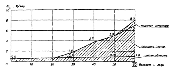 Если износ арматуры (Иa) превышает 60 %, арматурные стержни в расчете не учитывают. За расчетную величину Fa принимается суммарная площадь арматуры в пакете с учетом коррозии. Вероятностная модель процесса износа бетона защитного слоя по степени его карбонизации и выщелачивания: