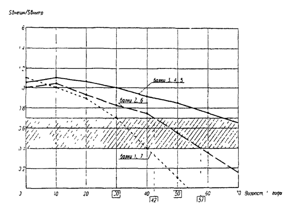 допустимой прочности бетона, Ø М170 (класс В12) для балок пролетных строений с обычной арматурой; Ø М250 (класс В20) для балок пролетных строений с напрягаемой арматурой. 5.5.2. По результатам расчетов строится график изменения условия прочности Sвнеш. £ Sвнутр., по которому определяется остаточный срок службы до потери работоспособности, Тр. Это время соответствует моменту, когда по одному из критериев условия прочности правая часть оказывается меньше левой на 30 %. На рис. 5.6 этот момент соответствует пересечению кривых графика с горизонтальной линией Sвнутр./Sвнеш. = 0,7. Рассчитанный по графику остаточный ресурс по работоспособности указывает на время эксплуатации до ремонта или реконструкции моста. 5.5.3. Остаточный срок службы по прочности определяется для случаев, когда: а) выполнен ремонт или реконструкция пролетного строения (определяется повторная работоспособность балок); б) из-за временной невозможности