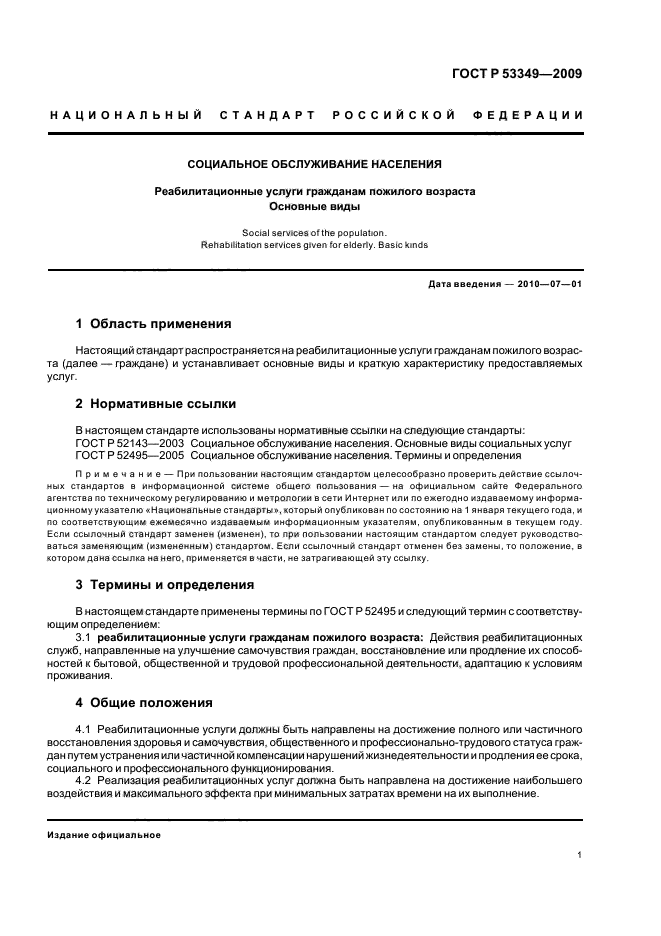 ГОСТ Р 53349-2009Социальное обслуживание населения. Реабилитационные услуги гражданам пожилого возраста. Основные виды